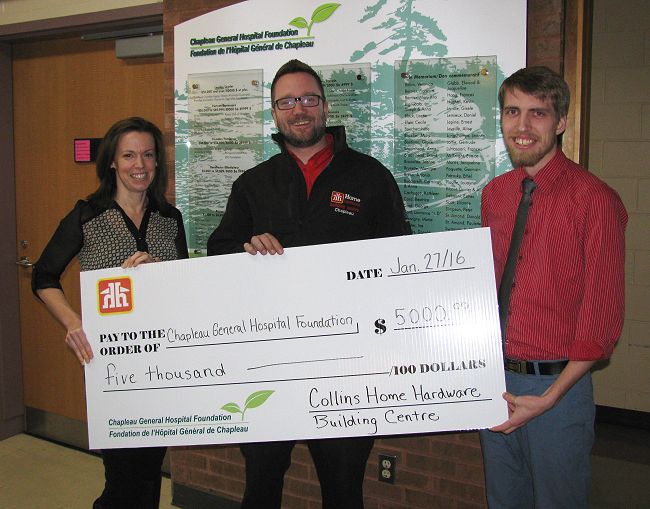 En janvier 2016, la Fondation de l'Hôpital Général de Chapleau a officiellement lancé sa campagne pour un nouvel appareil d'ultrason et nous sommes heureux d'annoncer que Collins Home Hardware a généreusement renforcé les efforts avec un don important. Depuis plus de 10 ans, Collins Home Hardware soutient les initiatives de soins de santé locaux et maintenant s'engage à une somme de 5000 $ vers de meilleures imageries médicale pour Chapleau.