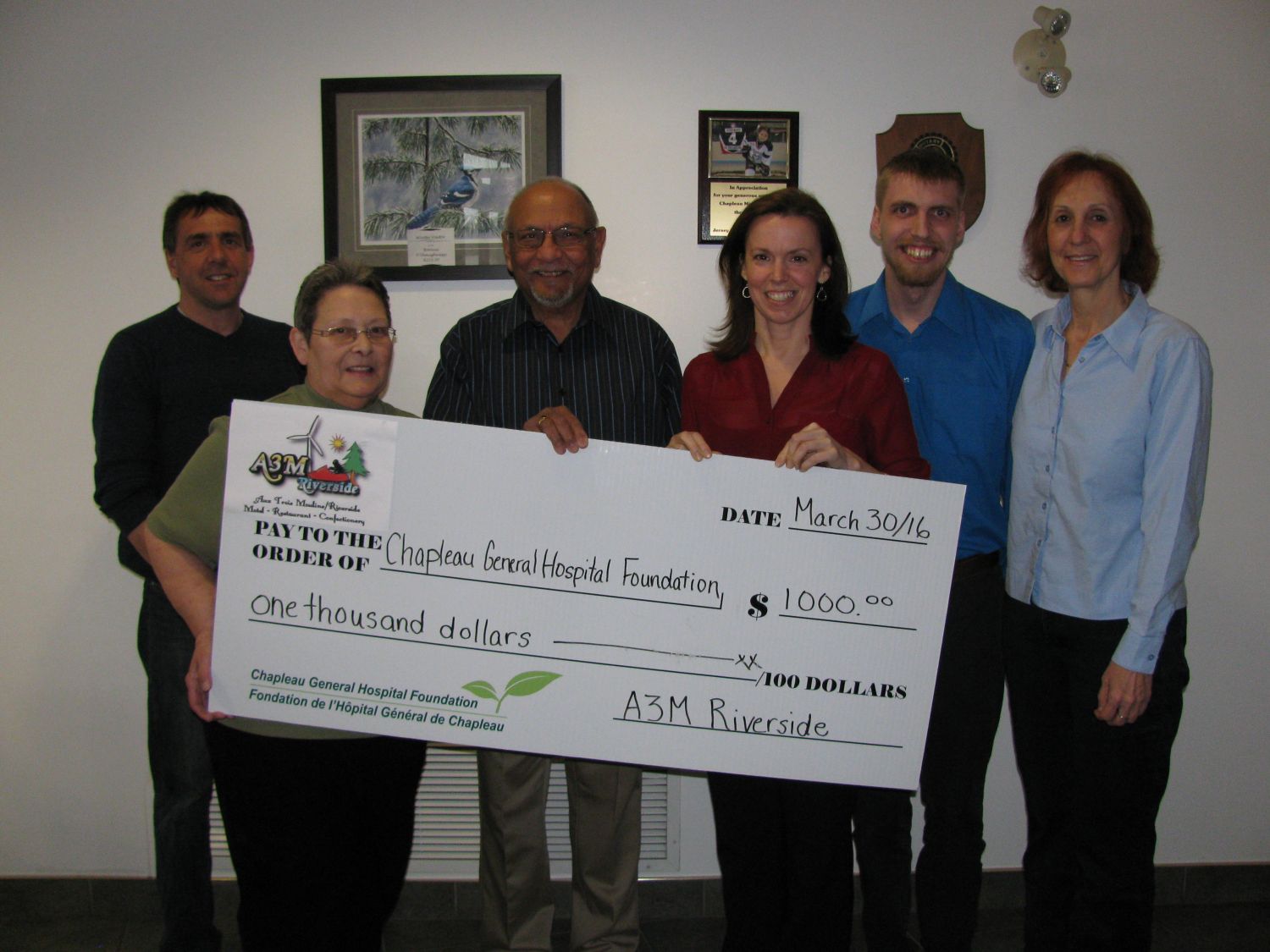 La Fondation Hôpital Général de Chapleau aimerait reconnaître Bob, Peter et Val Patel et toute l'équipe Siali Corporation qui comprend le restaurant, motel and dépanneurs Aux Trois Moulins, Riverside Motel et Chapleau Inn and Suites. Leur généreux don de