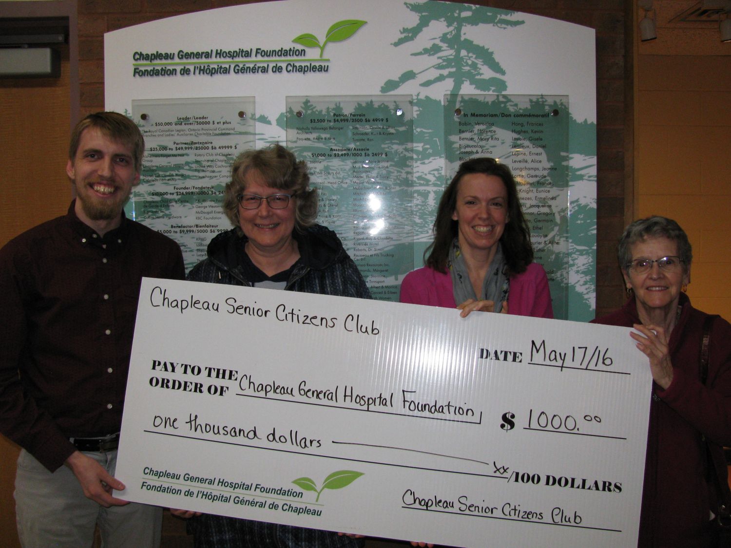 Nous tenons également à remercier chaleureusement le club de personnes âgées de Chapleau. Ils ont fait un don généreux de 1000 $ à la campagne pour de meilleurs ultrasons. Avoir accès à de meilleurs ultrasons à Chapleau est un avantage pour les gens de tous âges et nous remercions tous les membres du club de rendre notre but encore plus réaliste.